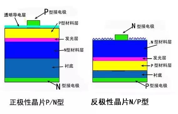 反極性燈管的發(fā)光晶片就屬于垂直結(jié)構(gòu),很顯然,垂直結(jié)構(gòu)有反極性,就有正極性,正、反極性晶片結(jié)構(gòu)是這樣的: